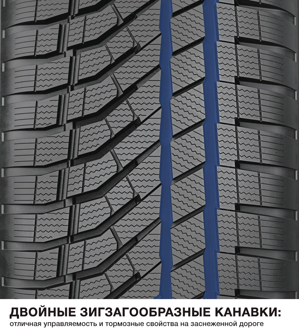 Двойная форма канавок создает дополнительные кромки зацепа, необходимые для прочного сцепления с заснеженной дорогой. Улучшенный контакт между заснеженной дорогой и шиной обеспечивает отличную управляемость и тормозные свойства на зимних дорогах.