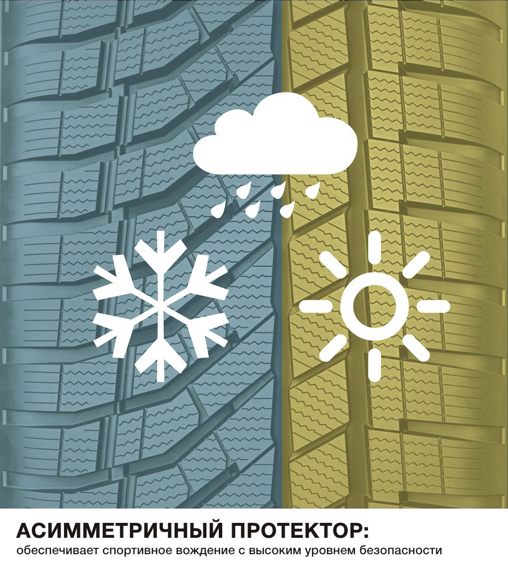 Комбинирование рисунка и зонирование протектора обеспечивает сбалансированный набор характеристик при любых погодных условиях. Внутренняя сторона шины адаптирована для эксплуатации на снегу и по слякоти, а внешняя — для сухого и влажного покрытия. Интеллектуальное взаимодействие обеих зон профиля обеспечивает спортивное вождение с высоким уровнем безопасности.